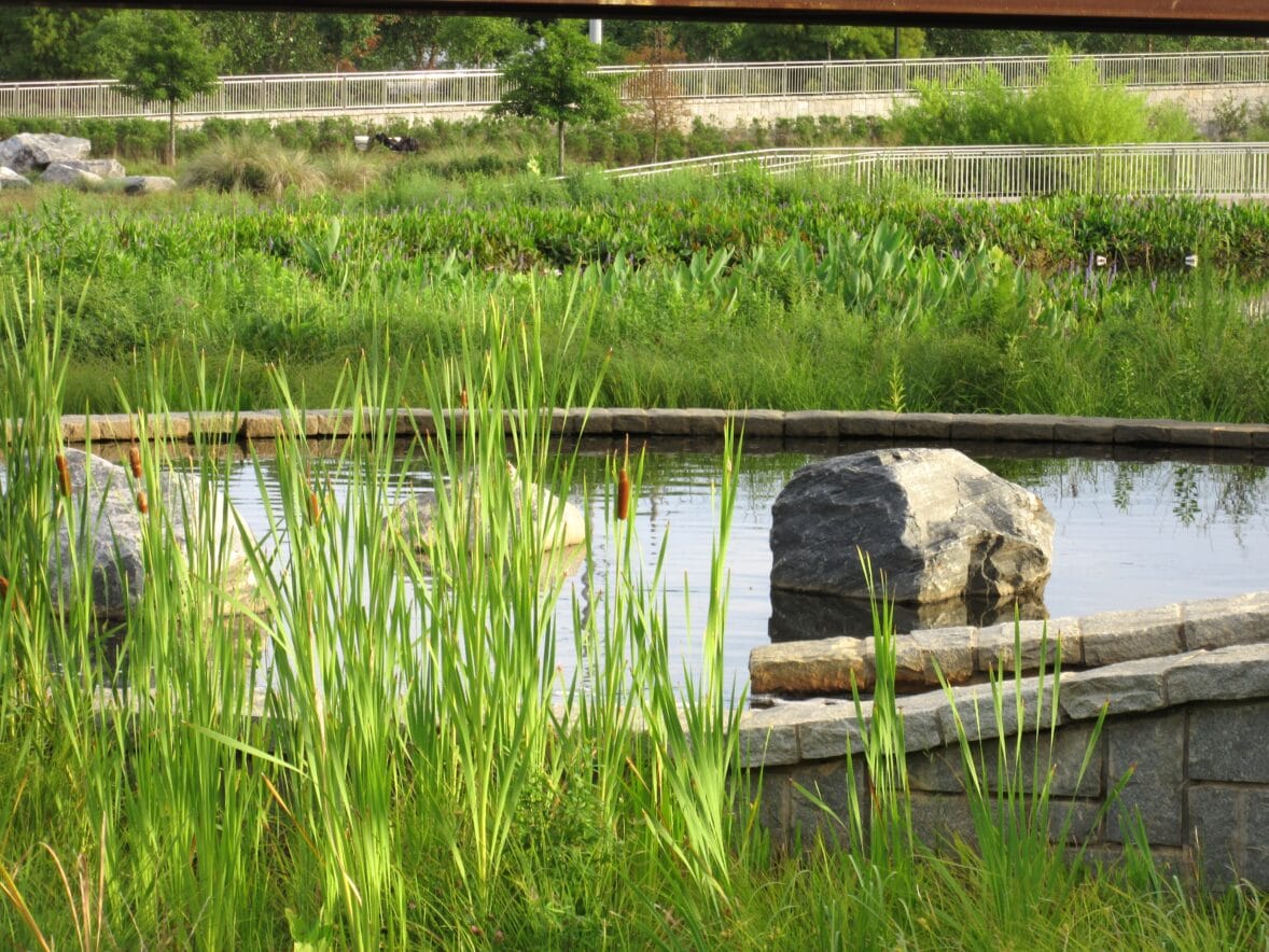 Ed Castro Landscape installed over 26,000 plants, including native species and grasses, and constructed wetlands with littoral shelf plantings to improve water quality and clarity. The park’s main pond, street-edge rain gardens, and grat lawn are supported by high-sand content soils and subsurface drainage systems, filtering stormwater runoff and controlling flooding. A state-of-the-art 2-wire irrigation system, designed by Bob Scott, enhances the park’s sustainability, making it both a valued community space and a vital green infrastructure component. Ed Castro Landscape collaborated seamlessly to complete this project to high acclaim.
